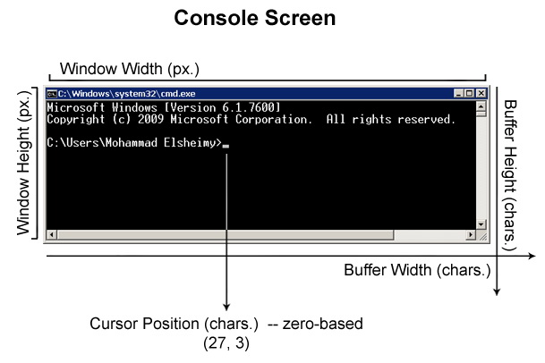 قبل أن نعرف كيفية الحصول على الأبعاد للـ Console برمجيا يجب علينا أولا دراسة شاشة الـ Console لنعرف كيف تتكون وما هي هذه الأبعاد التي نريدها.