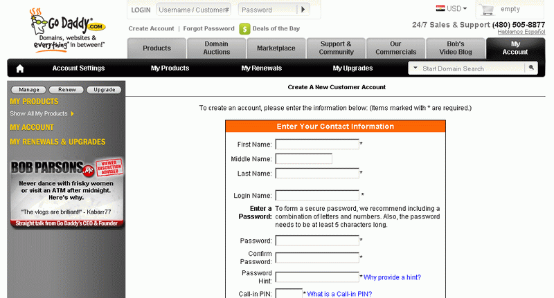 سنبدأ أولا بشرح خدمات الويب التي توفرها خدمة X.co ثم سوف نتعرض بعد ذلك لدوال REST التي توفرها. ولكن قبل ذلك، تحتاج إلى الحصول على المفتاح البرمجي API Key كي يمكنك استخدام الخدمة برمجيا، ولكي تستطيع الحصول على هذا المفتاح ستحتاج أولا إلى إنشاء حساب في Go Daddy إن لم يكن لديك واحد، ويتم ذلك عن طريق الذهاب إلى http://www.godaddy.com والضغط على Create Account في أعلى الصفحة (انظر شكل 1) ثم قم بملء هذه العريضة من البيانات المطلوبة واستكمال عملية التسجيل.