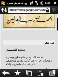 الآن أتركك تبدأ بتطوير موقعك للهواتف النقالة مع Google Mobilize. كمثال قمت بتصميم موقع بسيط يعرض بعض من لوحات الخط العربي (حصلت عليها من صفحة Arabic Calligraphy على فيسبوك، جزيل الشكر للقائمين على هذا الموقع) والذي يمكنك الوصول إليه عن طريق الرابط: https://sites.google.com/site/testarabiccalligraphy. وهذه بعض الصور من هاتفي النقال للموقع: